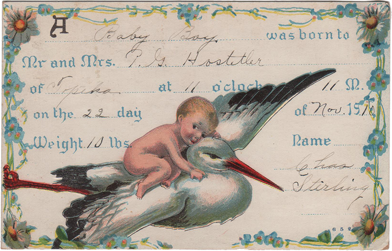 A “Baby Boy” was born to Mr and Mrs. “P. G. Hostetler” of “Topeka” at “11” o’clock “11” M. on the “22” day of “Nov.” 19″10″