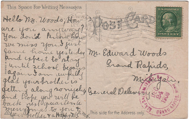 “Hello Mr. Woods; How are you anyway? You don’t know how we miss you. I just came home yesterday and expect to stay until school begans again I am awfully glad your brother is getting along so nicely, and hope you will be back next quarter. A merry xmas to you and your brother & a Happy N.Y.