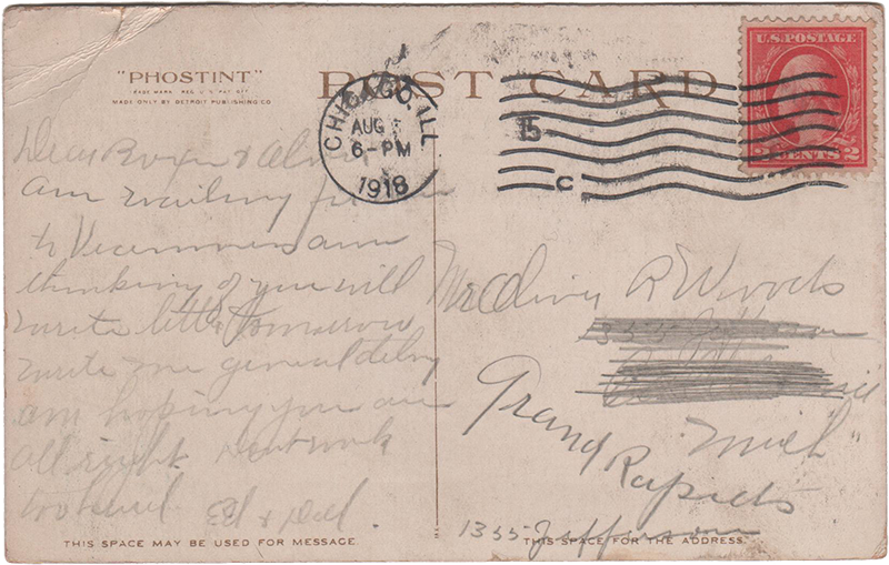 am waiting for train to V[???] am thinking of you will write little tomorrow write me general delivery am hoping you are all right Don’t work too hard. Ed & Dad”