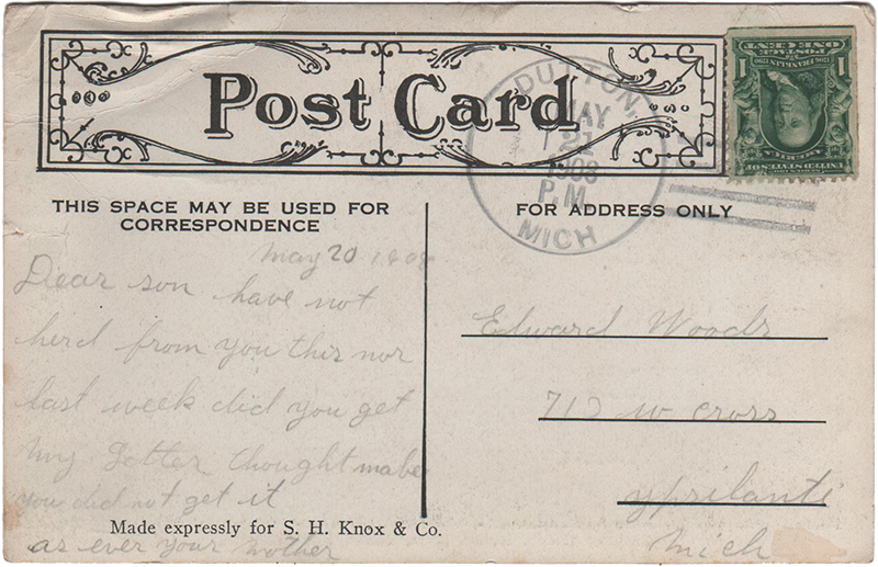 Bathing Beach, Reed’s Lake, Grand Rapids, Mich.Dutton, Mich., 21 May 1908 Edward Woods 713 W. Cross Ypsilanti Mich “May 20, 1908 Dear son have not herd from you this nor last week did you get my letter thought mabe you did not get it as ever your mother” Made expressly for S.H. Knox & Co.