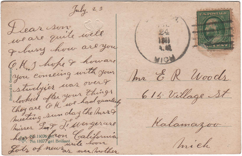 we are quite well & busy how are you O.K. I hope & how are you comeing with your studyies was over & looked after your things they are OK we had quarterly meeting sunday the Mrs & Misses [L. V. F.?] Wnger are home from California