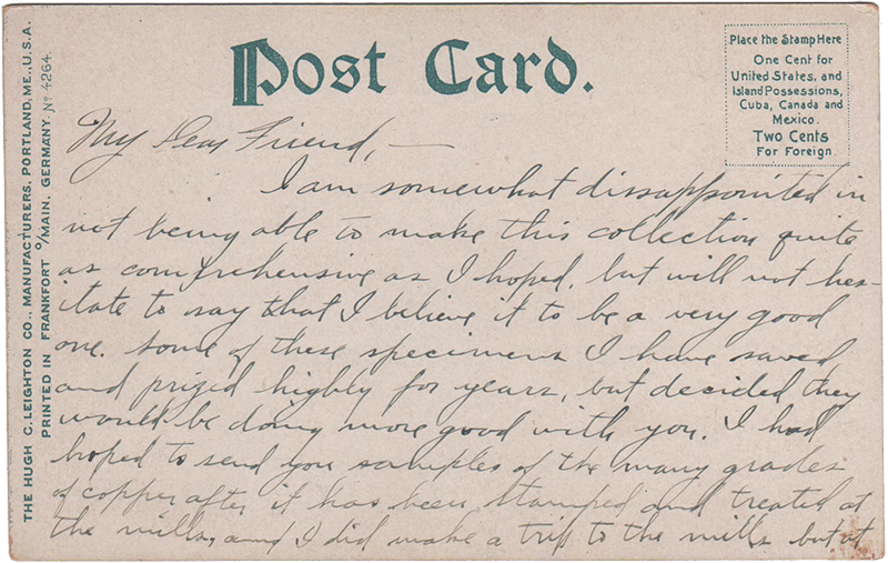 I am somewhat dissappointed in not being able to make this collection quite as comprehensive as I hoped, but will not hesitate to say that I believe it to be a very good one. Some of these specimens I have saved and prized highly for year, but decided they would be doing more good with you. I had hoped to send you samples of the many grades of copper after it has been stamped and treated at the mills, and I did make a trip to the mills but at”