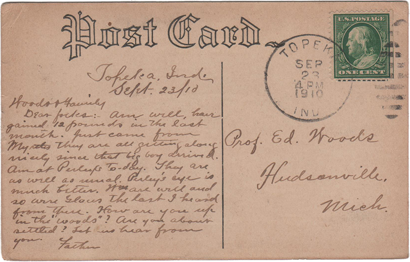 Dear folks:- am well, have gained 12 pounds in the last month. Just came from Myrtles they are all getting along nicely since that big boy arrived. A at Perleys To-day. They are as well as usual. Perley’s eye is much better. Wms are well and so were Glaces the last I heard from there. How are you up in the “woods”? Are you about settled? Let us hear from you.