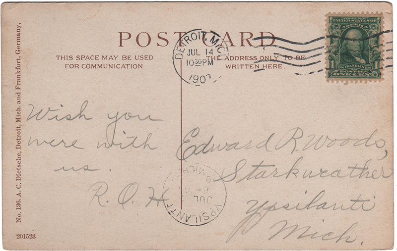 Detroit, Mich., Horticultural Building, Belle Isle.Detroit, Mich., 14 Jul 1907 Edward R. Woods, Starkweather Ypsilanti Mich. “Wish you were with us. R.O.H.” No. 136. A. C. Dietsche, Detroit, Mich. and Frankfort, Germany.