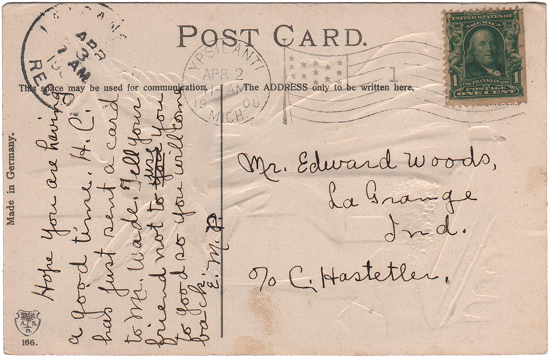 “Hope you are having a good time. H.C. has just sent a card to Mr. Wade. Tell your friend not to use you to [sic] good so you will come back.