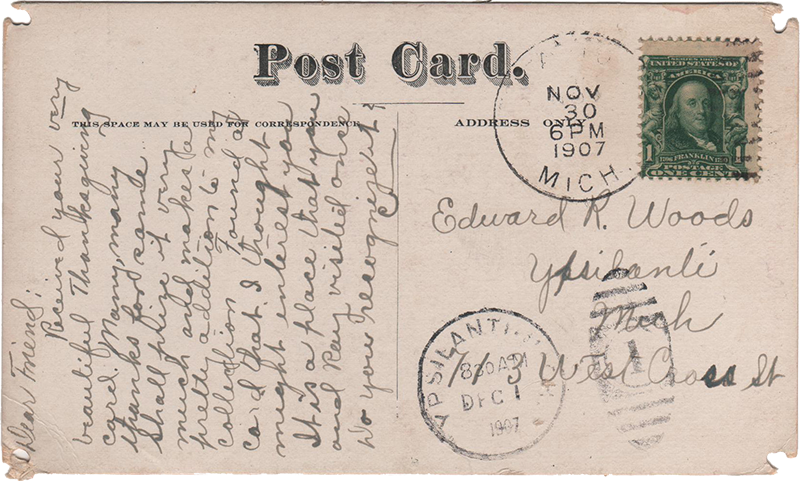 Dear Friend: Received your very beautiful Thanksgiving card. Many, many thanks for same. Shall prize it very much and makes a pretty addition to my collection. Found a card that I thought might interest you. It is a place that you and Ray visited once. Do you recognize it? C”
