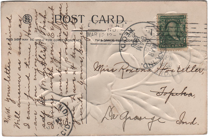 “3/10/08. Your letter received. Will answer as soon as I can find time. How are you enjoying your self at Myrtle’s? Wish I were with you. Expect to be sometime in June. Send me a postal when you haven’t time to write. Your, Grayce.”