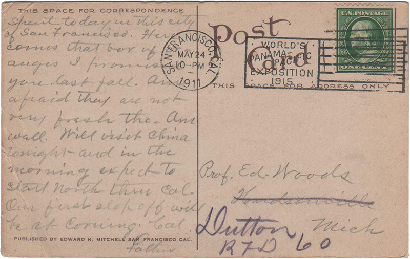 “Spent today in this city of San Francisco. Here comes that box of oranges I promised you last fall. Am afraid they are not very fresh tho. Am well. Will visit China tonight—and in the morning expect to start north thru Cal. Our first stop off will be at Corning, Cal.