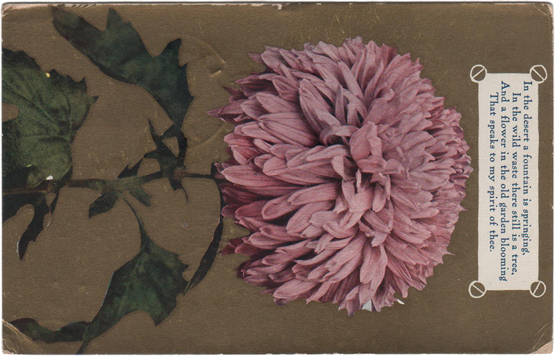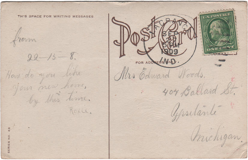 In the desert a fountain is spring, In the wild waste there still is a tree, And a flower in the old garden blooming That speaks to my spirit of thee.LaGrange, Ind., 27 Sep 1909 Mrs Edward Woods 404 Ballard St. Ypsilanti Michigan. “from 22-15-8. [V.O.H.?] How do you like your new home, by this time.[,?] Roxie.”