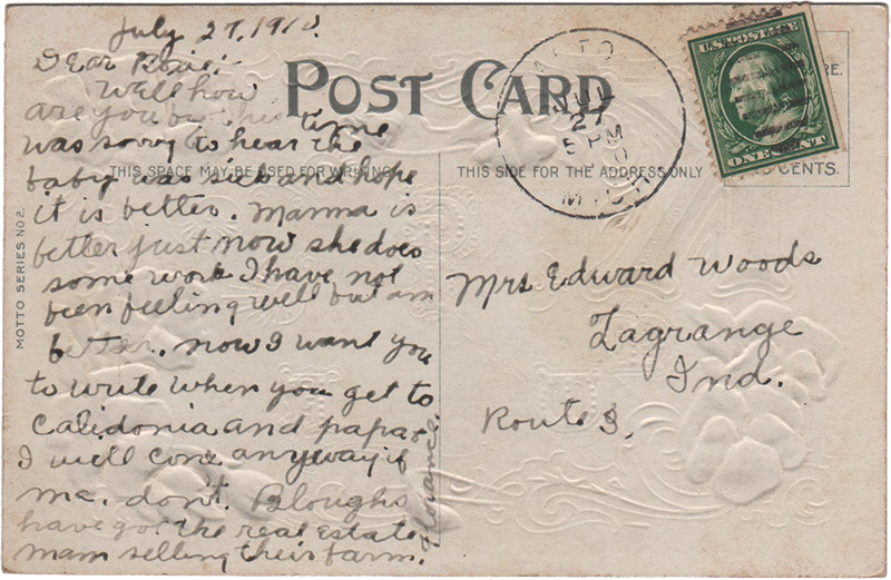 Well how are you by this time was sorry to hear the baby was sick and hope it is better. Mamma is better just now she does some work I have not been feeling well but am better. Now I want you to write when you get to Calidonia, and papa & I will come anyway if we don’t. Bloughs have got the real estate man selling their farm.