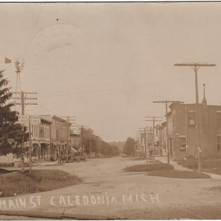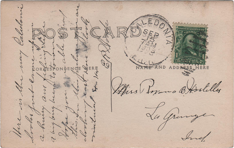Main St Caledonia MichCaledonia, Mich., 15 Sep 1908 Miss Roxana O. Hostetler La Grange Ind. “Here is the way Caledonia looks just come up in a hurry am feeling like a big bug been to town. Hope you are able to read this. In this picture you are looking east. Does it look natural Ha Ha ER Woods”