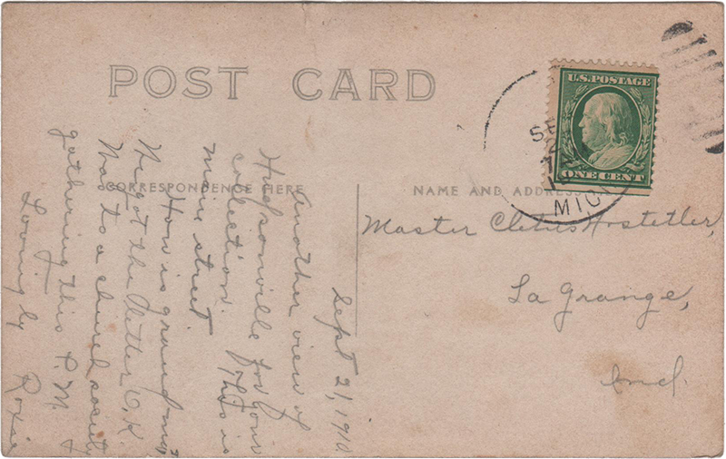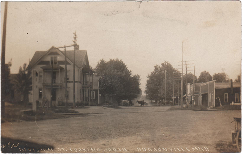 No 14 Division St. Looking South Hudsonville, Mich[Hudsonville?], Mich., 22 Sep 1910 Master Cletus Hostetler, La Grange, Ind. “Sept 21, 1910. Another view of Hudsonville for your collection. This is main street. How is grandma? We got the letter O.K. Was to a church society gathering this P.M. Lovingly Roxie”