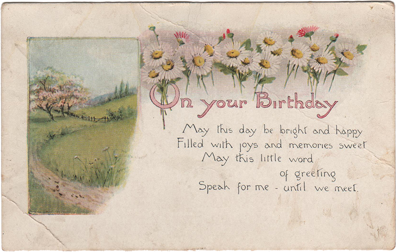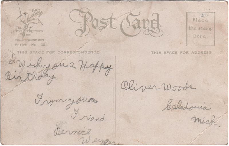On your Birthday May this day be bright and happy Filled with joys and memories sweet May this little word of greeting Speak for me — until we meet.[no postmark] Oliver Woods Caledonia Mich. “I wish you a Happy Birthday. From your Friend Bernice Wenger”