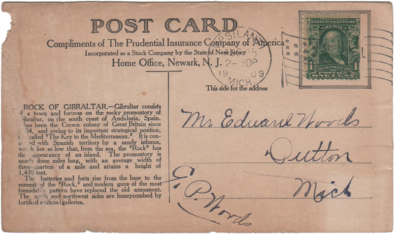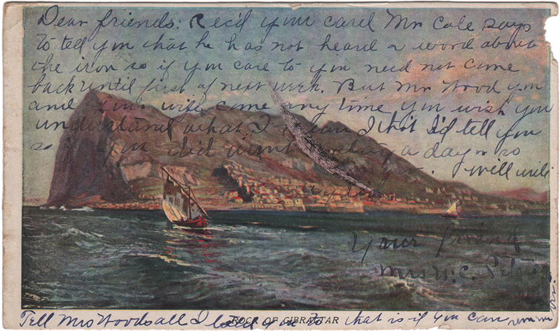 Dear friends: Rec’d your card Mr Cole says to tell you that he has not heard a word about the iron so if you care to you need not back until first of next week. But Mr Wood you and your wife come any time you wish you understand what I mean. I tho’t I’d tell you so if you did want to stay a day or so [???] Will write [???]