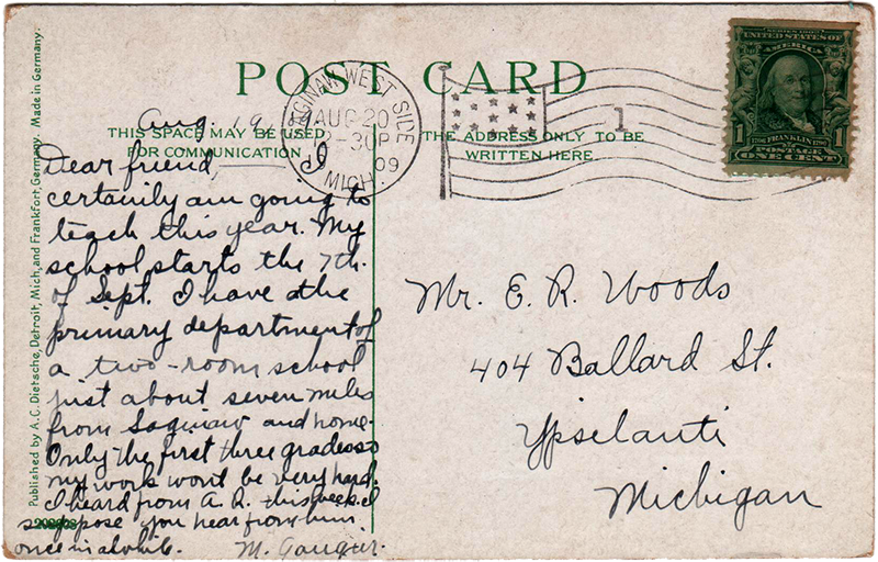 Dear friend,— I certainly am going to teach this year. My school starts the 7th of Sept. I have the primary department of a two-room school just about seven miles from Saginaw and home. Only the first three grades so my work won[‘]t be very hard. I heard from A.R. this week. I suppose you hear from him once in awhile. M. Gaugier.”