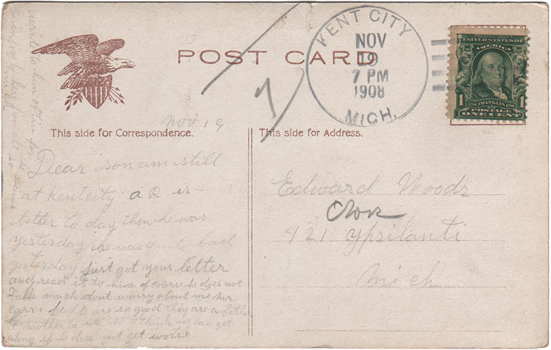 Dear son am still at Kent City A R is some better to day then he was yesterday he was quite bad yesterday just got your letter and read it to him of course he does not talk much don’t worry about me Mr Carr’s people are so good they are a father and mother to us so I think we can get along if he does not get worse.
