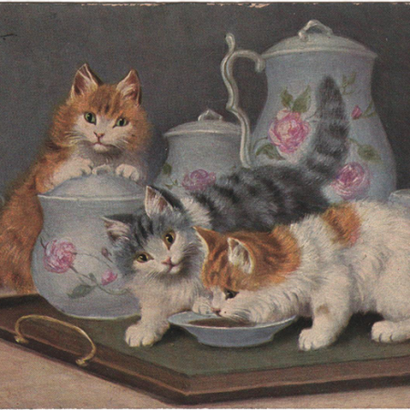“Here are some tea drinking cats to help you celebrate your birthday. These will not affect your nerves even in the hottest weather. Don’t know the exact date of your birth day but thought this would be appropriate for the occasion.