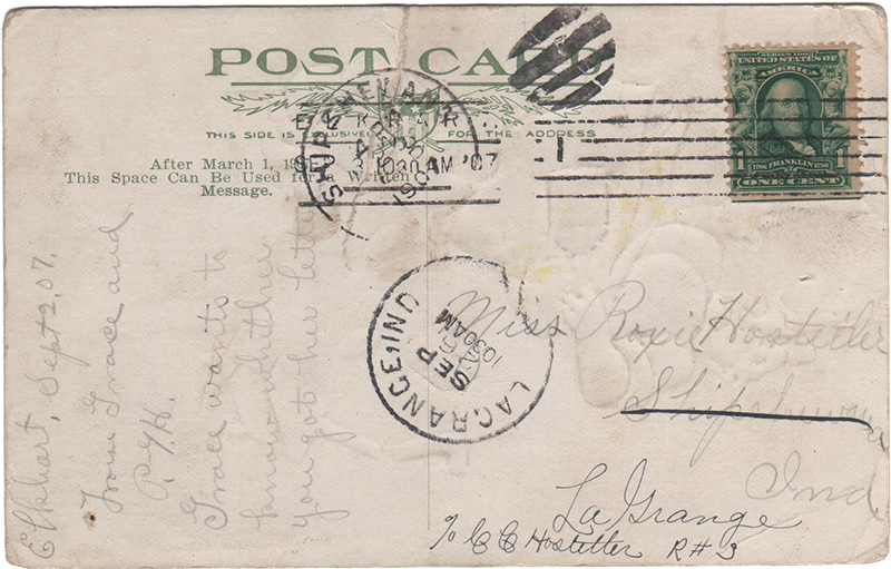 We Had a Brand Blow-OutShipshewana, Ind., 25 Sep 1907 Miss Roxie Hostetler Shipshewana [crossed out] Ind. La Grange c/o C C Hostetler R#3 [written in different hand] “Elkhart, Sept 2, 07. From Grace and P.G.H. Grace wants to know whether you got her letter.”