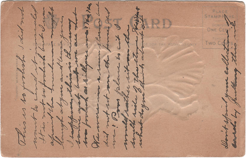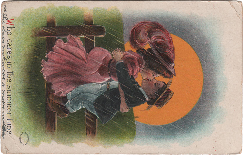 “This is so foolish I did not want to send it unsealed. It is not so foolish but I was afraid the mailman might laugh at you and tease you. I suppose this is the very same wet but we are not so foolish as [???] was? Ha Ha. We were in a rain storm but did not set on the fence did we? Poor place to sit I would rather sit on the south side of the [stove? store?] Ha Ha! What do you think about it